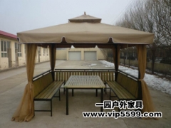 金属框架,靠背座位是樟子松防腐木,顶棚是涤纶加厚防雨防紫外线布。四周是纱帘,夏天可以防蚊虫。户外专用遮阳布,防雨防晒防紫外线。是家人休闲聚会的必备户外用品户外休闲帐篷价格咨询:010-57112393